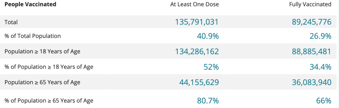 截至4月23日发稿,全美共有31,951,438例新冠病毒,其中569,875死亡。 图源:Google 疾控中心(CDC)的最新数据显示,91,175,995人(即约27.5%的成年人)已完成接种;137,234,889人(即41.3%的成年人)至少接种了一剂新冠疫苗。 图源:CDC 本文要点 FDA和CDC决定恢复接种强生新冠疫苗 全美报告15例强生新冠疫苗相关血栓病例 国务院调高百余目的地旅行警告 疾控中心首次建议孕妇接种新冠疫苗 FDA和CDC决定恢复接种强生新冠疫苗 图源:CNN 美国疾病预防控制中心(CDC)和美国食品药品监督管理局(FDA)表示,他们已于周五取消了对强生公司冠状病毒疫苗使用的暂停建议。 4月13日,CDC和FDA在得知最近收到疫苗的女性中有6例罕见的血液凝结综合征病例后,建议暂停接种强生疫苗。周五早些时候,疾控中心免疫实践咨询委员会建议取消暂停。 CDC和FDA在一份联合声明中表示,卫生系统和疫苗接种者将被警告疫苗引发潜在致命并发症状的风险,包括严重的血栓和血小板减少。 全美报告15例强生新冠疫苗相关血栓病例 疫苗专家报告称,全美已经有15人在接种强生新冠疫苗后,出现严重血栓问题,包括三例死亡,七例住院治疗,五例已经出院。 报告称,这15例出现血栓的患者均为女性,其中13人的年龄是在50岁以下。此外,有12例涉及罕见的脑血栓病例。 截至21日,美国约有400万女性接种了强生疫苗。今天,联邦卫生部门取消强生疫苗的暂停接种措施,美国将有超过900万剂强生疫苗可以立即投入使用。 图源:CNN 国务院调高百余目的地旅行警告 美国国务院在本周更新了对全球各国的旅行警告,新增116个国家到最高级别第四级旅行警告名单,建议美国公民不要前往。 目前全球有大约80%的国家都在第四级旅行警告名单之上,包括加拿大、墨西哥、德国、英国。 而中国、日本、澳大利亚等国为第三级别,慎重考虑前往。 16个国家和地区被归类为第二级别,旅行者应提高警惕,其中包括新加坡、泰国、越南、韩国等。 国务院表示,除了新冠传播的水平外,在发布4级警告的决定中还考虑了其他因素,包括病毒检测的能力以及这些国家针对美国公民的旅行限制。 疾控中心首次建议孕妇接种新冠疫苗 近期发表在《新英格兰医学杂志》上的研究发现,初步数据显示,辉瑞和莫德纳疫苗对孕妇安全有效。 疾控中心周五首次建议孕妇接种新冠疫苗。 研究人员此前对超过3万5千名在怀孕期间或怀孕前接种了新冠疫苗的女性进行监测,当中包括827名孕妇。监测结果显示,共有86%的孕妇安全地生下婴儿,而流产和早产的比率,与未接种疫苗的孕妇一致。与出现新冠症状的未怀孕人群相比,孕妇因新冠患重病或死亡的风险更高。 研究发现,孕妇与其他群体出现的副作用相同,且未发现孕晚期的疫苗接种者出现安全问题或婴儿出现安全问题。 信息来源:The White House、CBS News、CDC、NBC News
