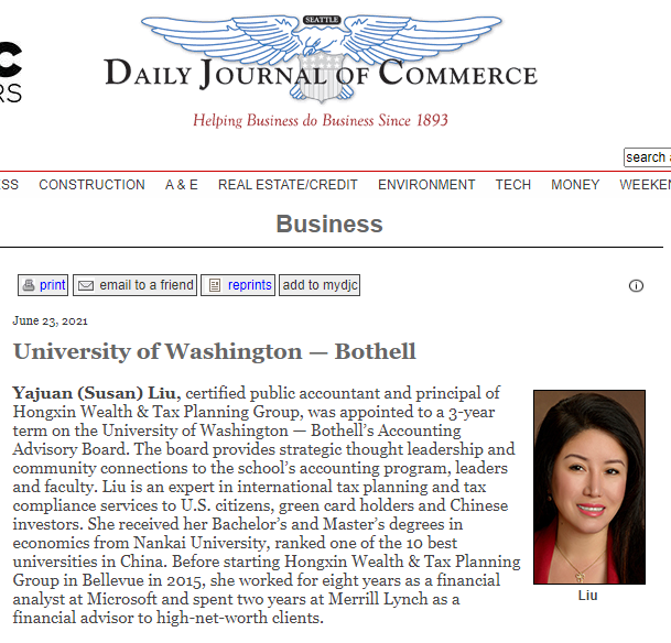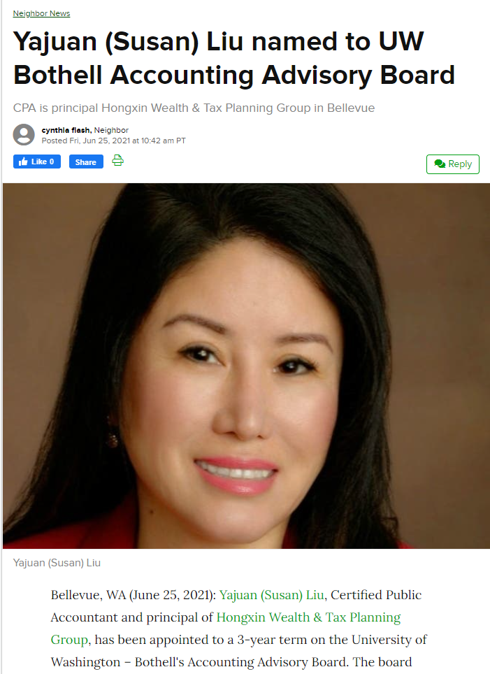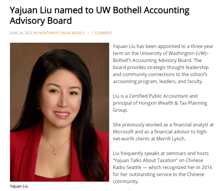 刘亚娟总裁凭借卓越的专业能力和良好的声誉,很荣幸被任命为华盛顿大学(UW)巴塞尔会计学院董事。董事会是由华盛顿州知名专业人士组成,他们与学院领导共同为学院提供发展战略和经营计划。刘总作为资深的注册会计师,她将为商学院会计和税务研究生给予学术和专业上的指导,并培养他们的领导能力。