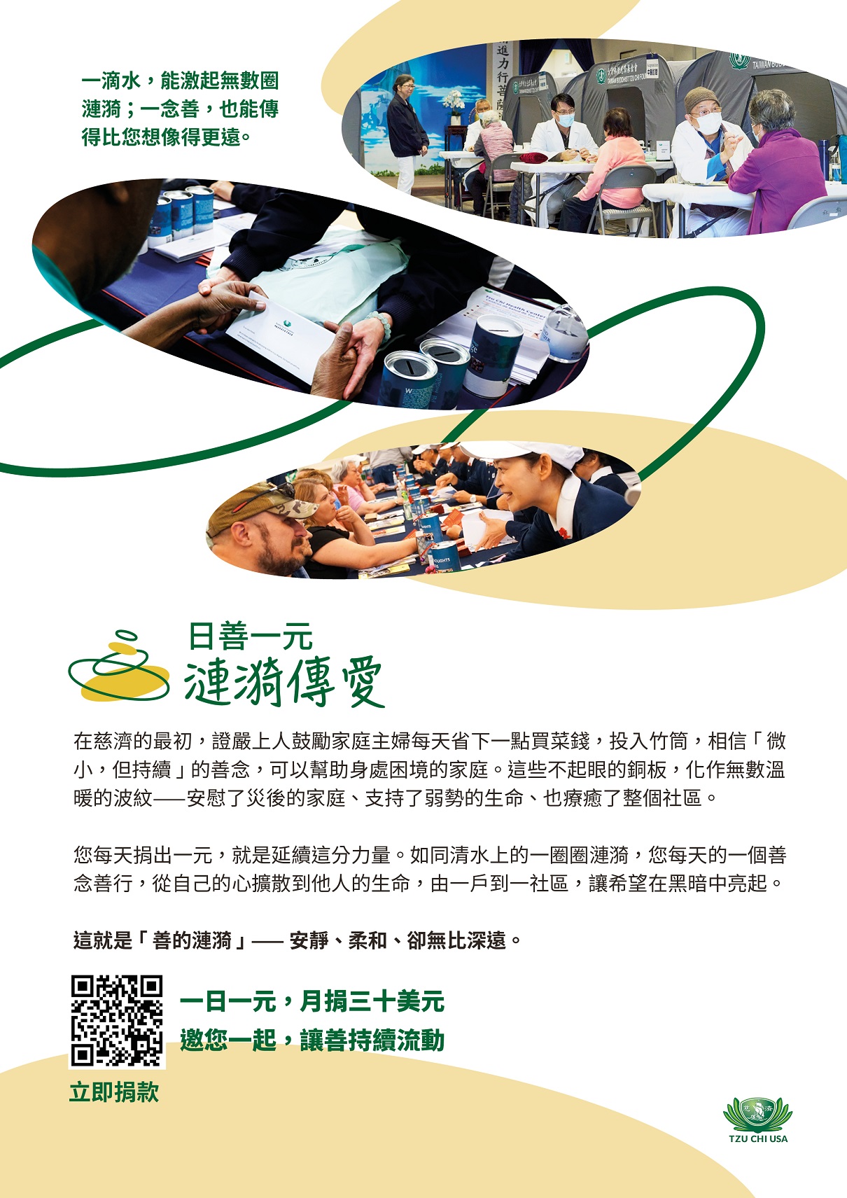 在台灣花蓮60年前,證嚴法師創立慈濟時,鼓勵30位家庭主婦每天發一個善念,省下五毛買菜錢,投入竹筒行善。這微小,卻持續的善念,匯聚成巨大的能量,直至今日,慈濟已在全球幫助139個國家/地區,為無數需要幫助的人帶去希望。每天一元,看似微小,卻能如水面上的漣漪,一圈一圈向外擴散,讓愛與善的力量,流轉不息,請加入慈濟美國「日善一元.漣漪傳愛」行動:https://tzuchi.us/zh/donate